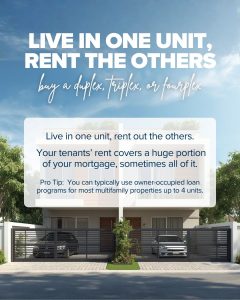Shop 2–4 unit properties (duplex/triplex/fourplex). When you buy a multi-unit property and live in one unit, you get to enjoy owner-occupied financing rates. You can live in one of the units and rent the other(s) to help offset your mortgage payment. This could even allow for a lower down payment. It is important to calculate your potential monthly payment and assess rental rates in the area to figure out how having a renter(s) would help offset your monthly overhead. Also, consider if you had a vacancy, could you still make it work while you tried to fill it.